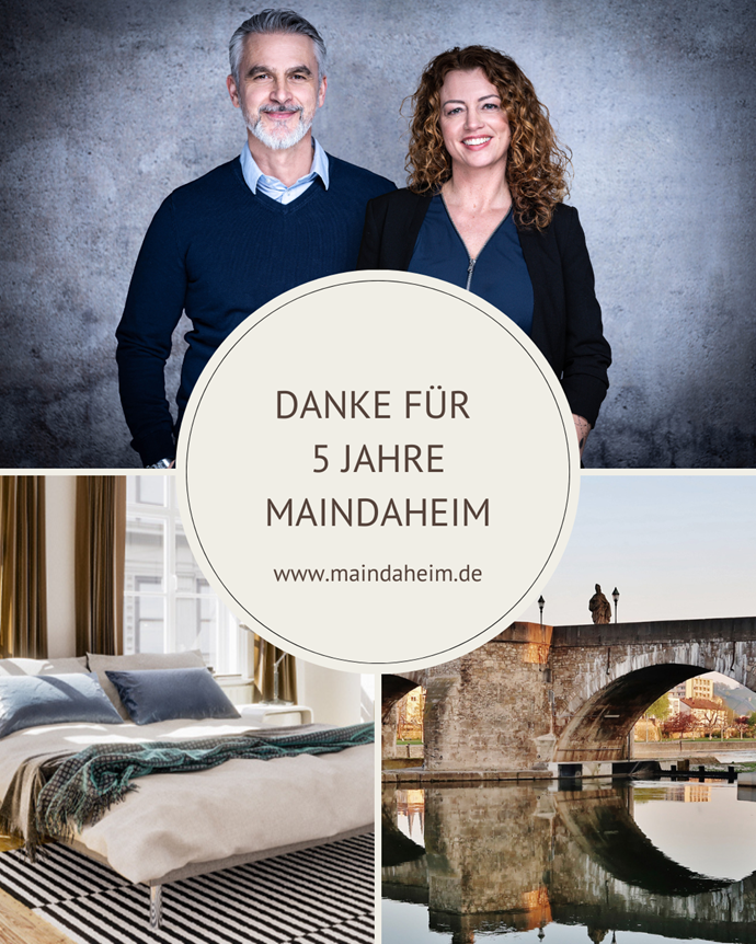Wir feiern das 5-jährige Bestehen der maindaheim! Herzlichen Dank für Ihre Treue und die gemeinsame Zusammenarbeit. Wir freuen uns auf weitere erfolgreiche Jahre und bedanken uns bei unseren MEHR
