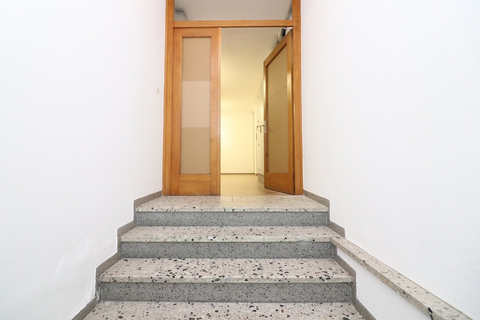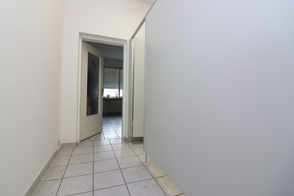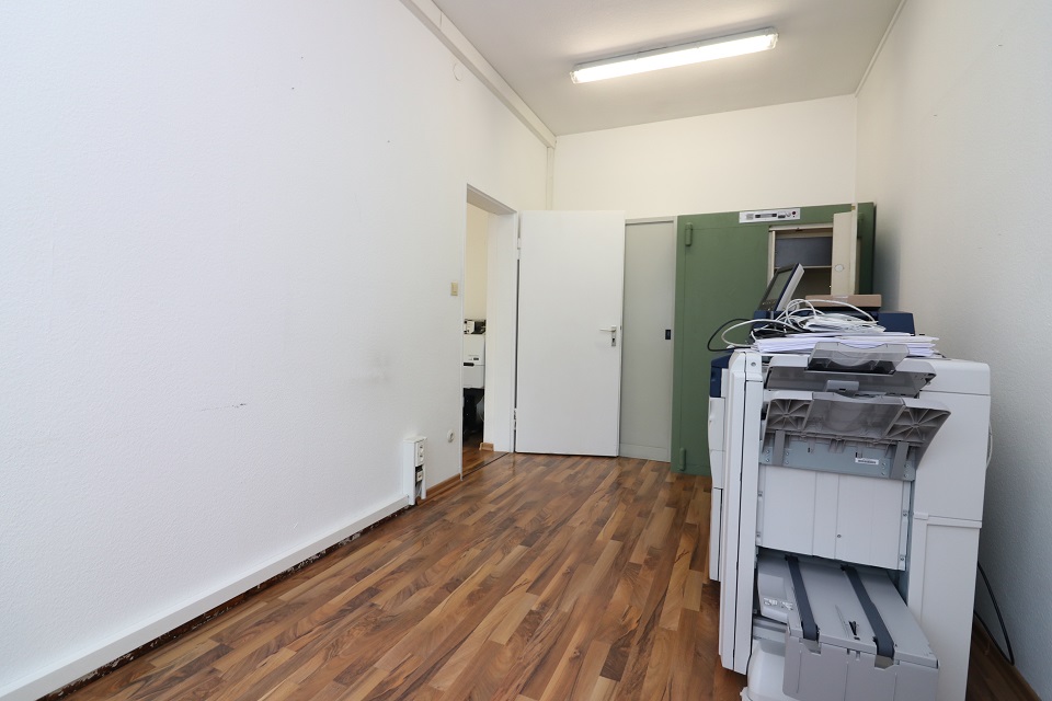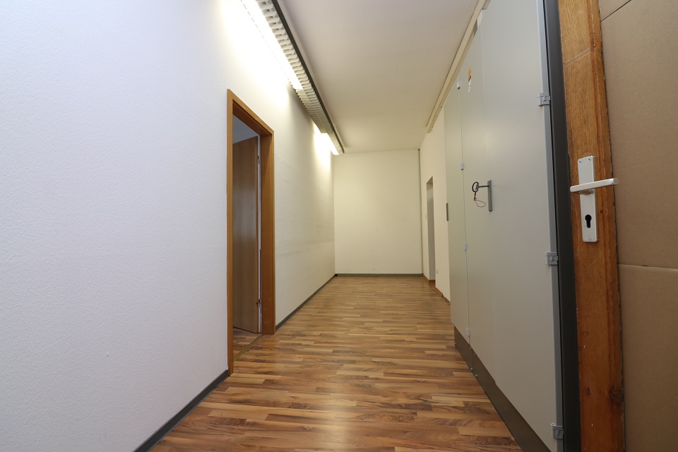 Der mit einer Glastüre versehene Eingangsbereich wirkt einladend und repräsentativ. Dieser, die weiteren abgetrennten Büroflächen sowie die Küche sind mit Laminatboden ausgelegt.