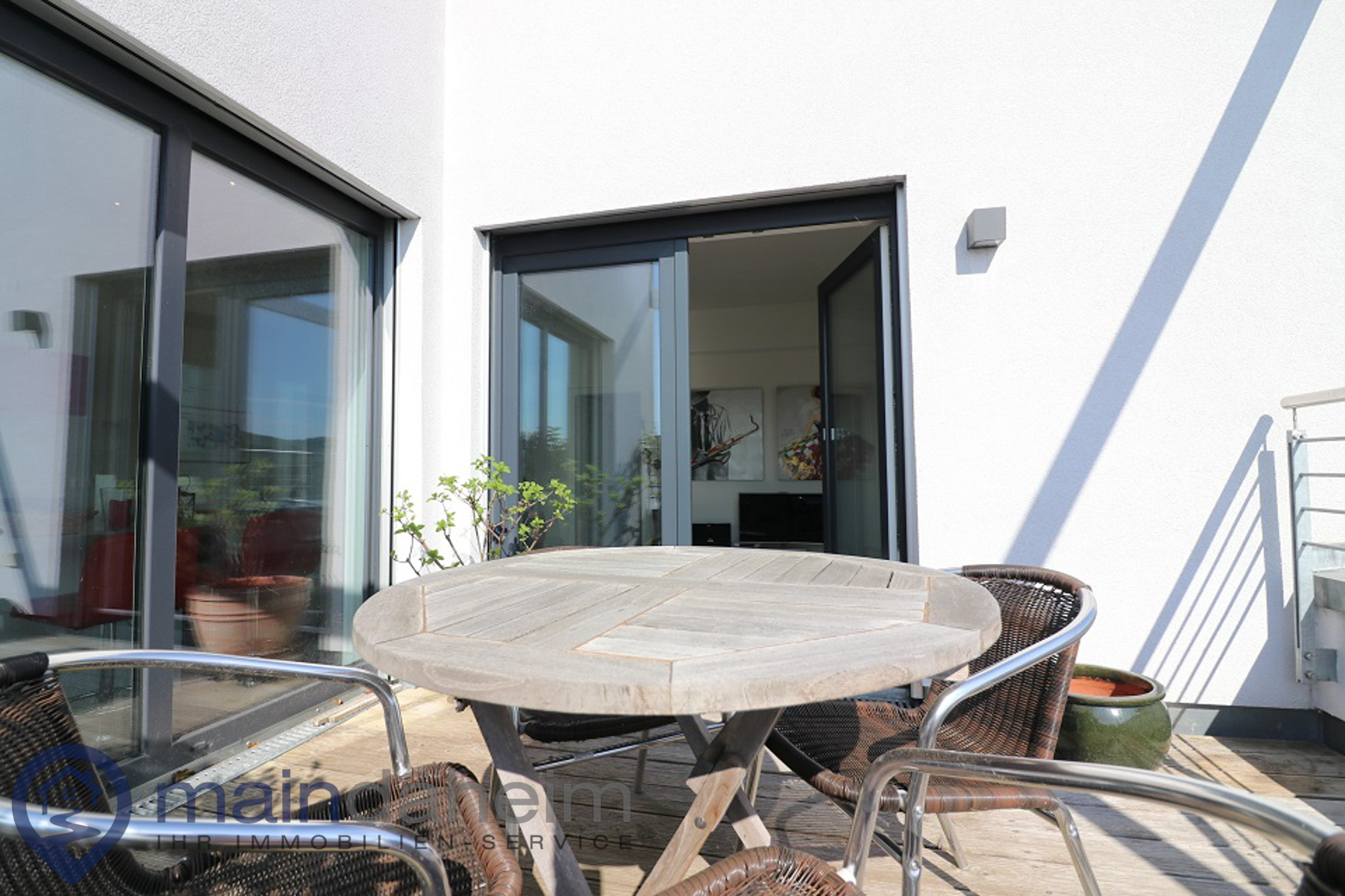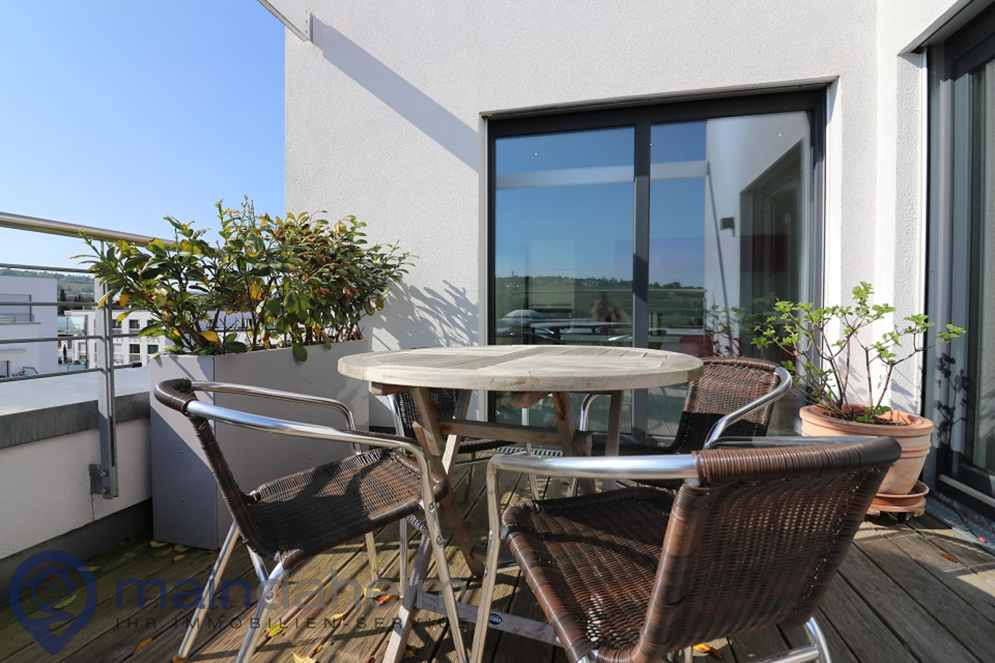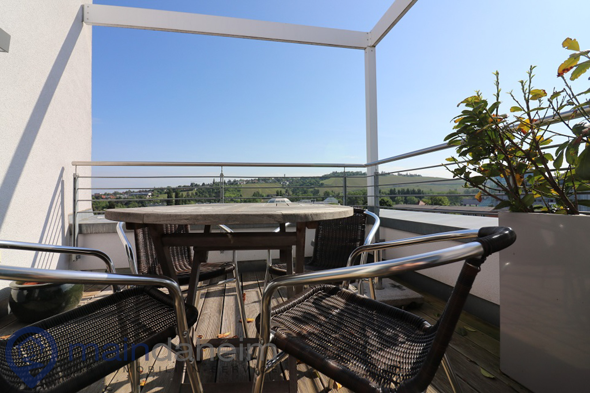 Die ca. 9qm große nach Nordost gerichtete Terrasse ist von hier aus begehbar und lädt zum Relaxen ein. Diese ist für den neuen Mieter auf Zeit mit einem Tisch und Stühlen ausgestattet, einige Grünpflanzen runden den gemütlichen Eindruck der Terrasse welche einen schönen Ausblick auf die Weinberge bietet noch ab.