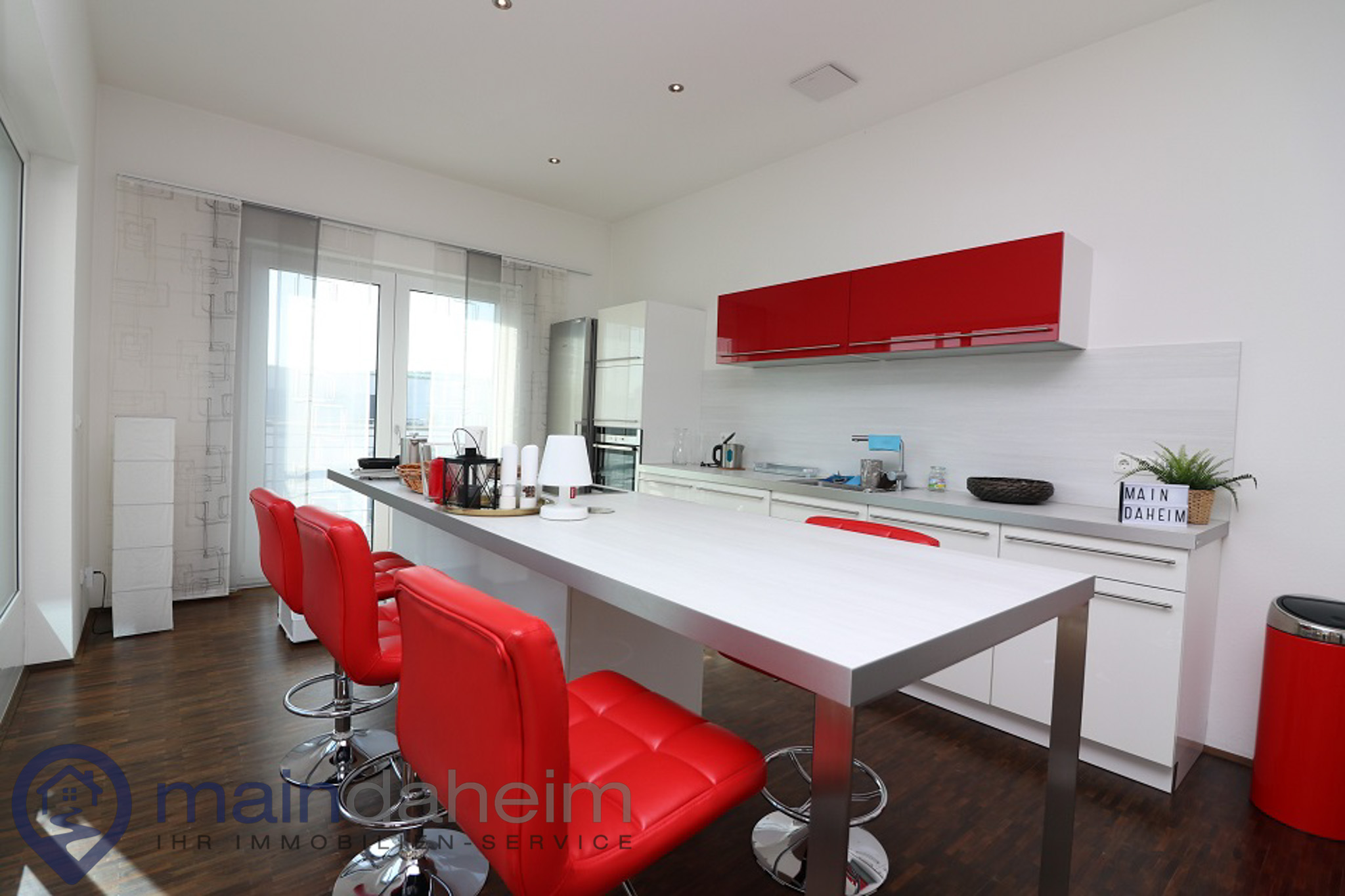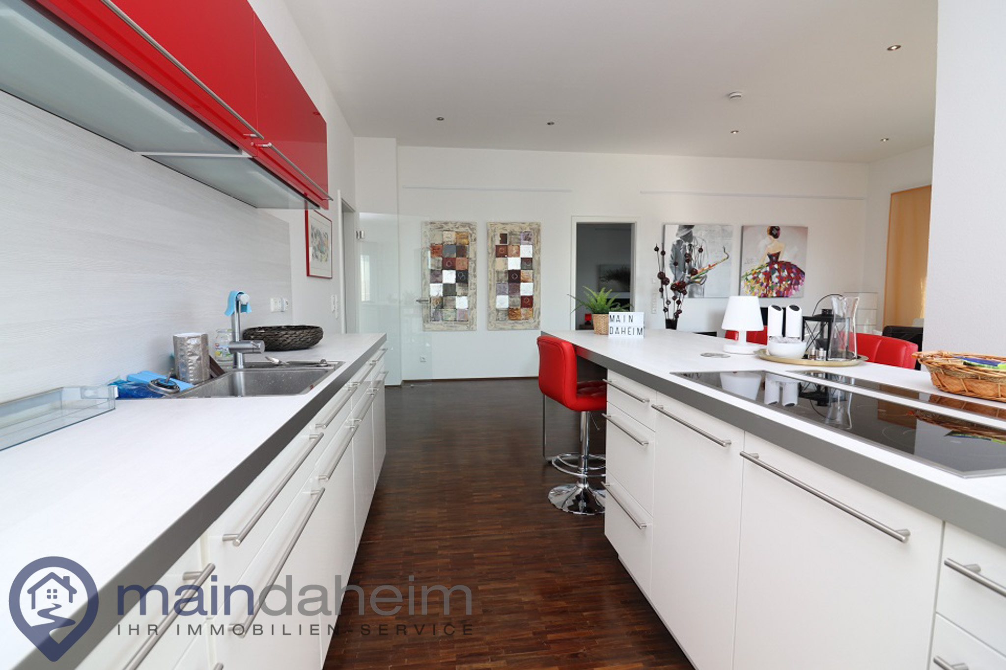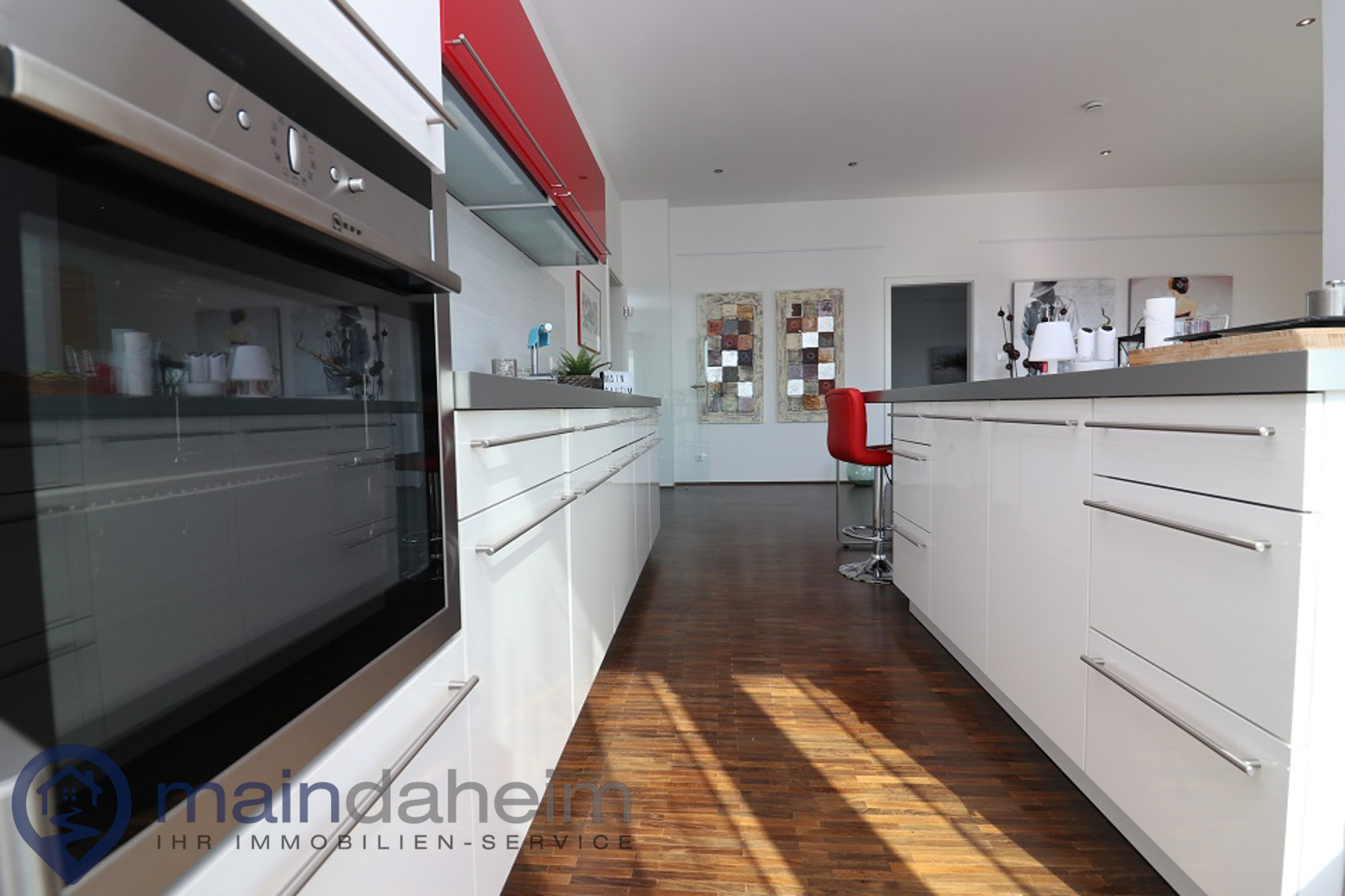 Der Flur führt in die lichtdurchflutete Wohnküche. Diese ist mit einer modernen, helle Einbauküche ausgestattet und verfügt unter anderem über eine Kochinsel, Spülmaschine, Backofen, Herd und sämtliches Kücheninventar. Als Ess- und Arbeitsbereich bietet sich die verlängerte Kochinsel an welche mit gemütlichen Barhockern in Leder möbliert ist.