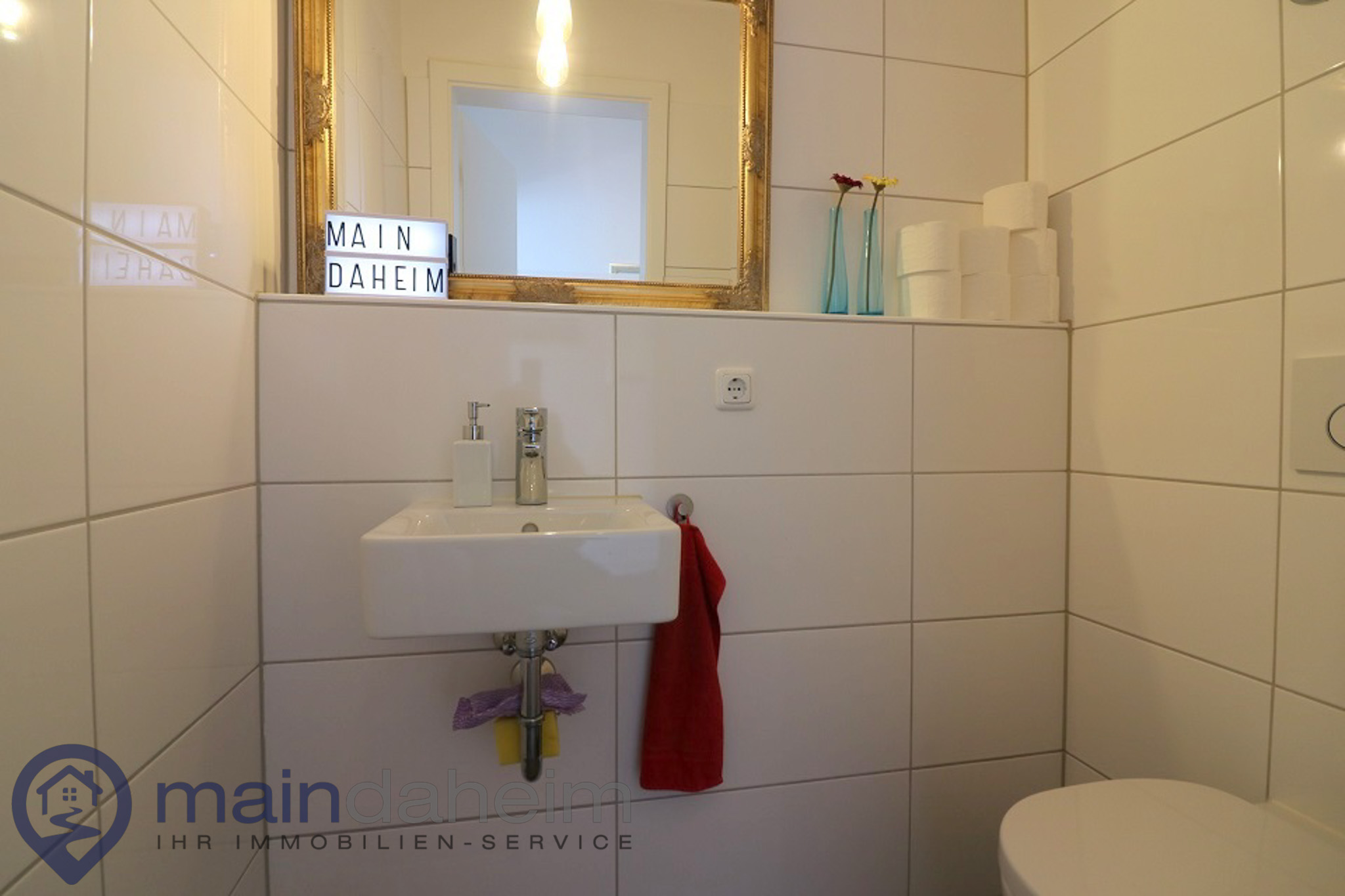 Im Eingangsbereich empfängt den neuen Mieter auf Zeit das innenliegende und modern geflieste Gäste-WC. Ebenfalls befindet sich im Eingangsbereich eine Garderobe.
