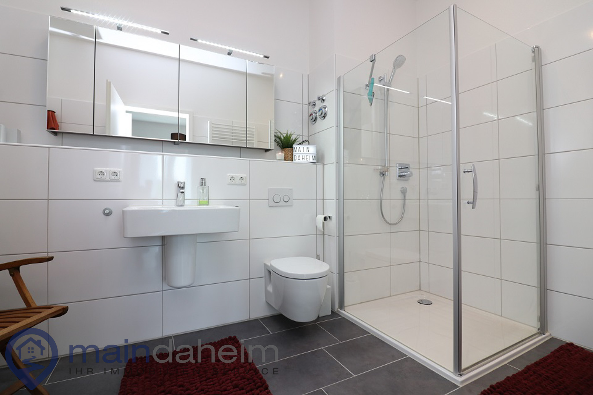 Von hier aus ist das innenliegende Badezimmer aus begehbar. Dieses verfügt über eine bodentiefe Dusche mit Glasabtrennung, einen großen Spiegelschrank sowie ein Regal und eine Waschmaschine.