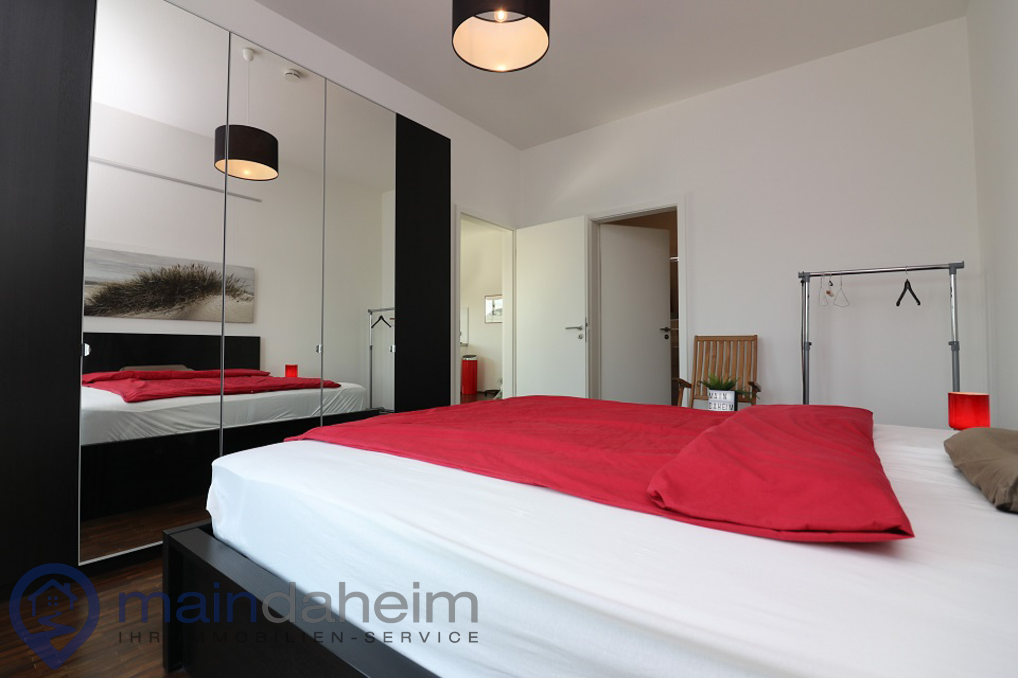 Das Schlafzimmer ist geräumig geschnitten und mit einem großen PAX Kleiderschrank sowie einem 1,80m Doppelbett und Nachttischen möbliert.