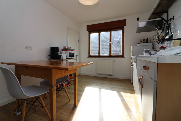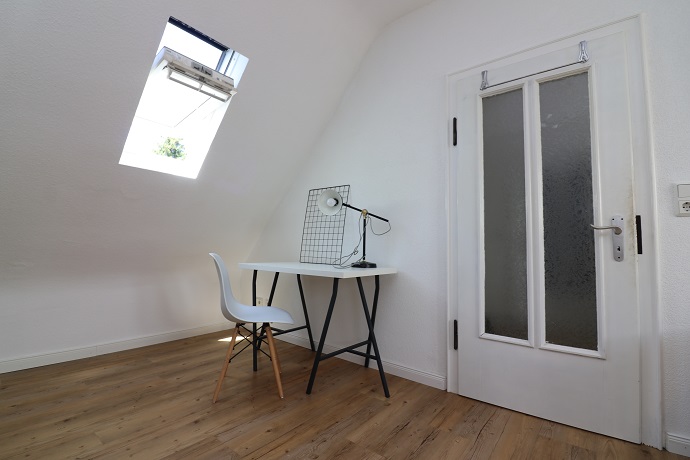 Das ca. 18qm grosse Zimmer ist mit Vinylboden ausgelegt und Teil einer 5-er WG in einem renovierten, urgemütlichen Haus in Rimpar. Die Möblierung besteht aus einem 1,40m breiten Bett, einer weißen Kommode, einem Schreibtisch mit Stuhl, sowie einer Kleiderstange und diversen Lampen.