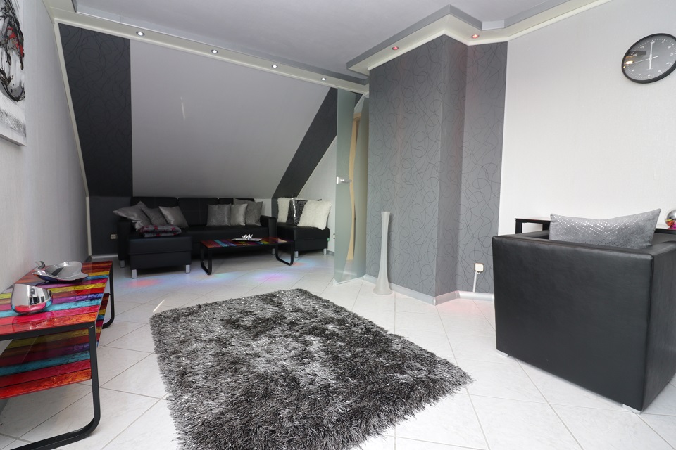 - Weiteres, ca. 19,50qm grosses Wohnzimmer mit schwarzer Ledercouch, Regalen & TV.