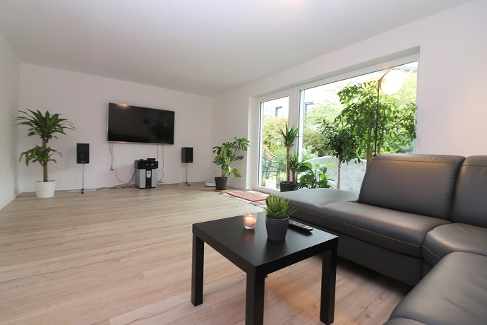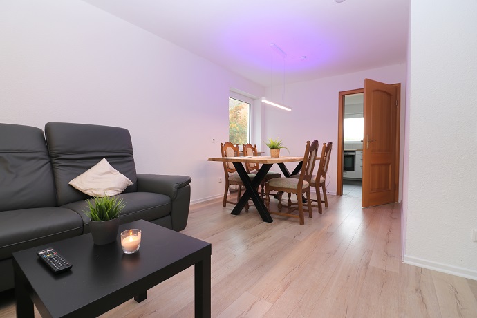 Den Mieter empfängt eine ca. 10qm grosse Diele. Von hier aus ist das mit 33qm großzügig geschnittene Wohn-Eßzimmer aus zugänglich. Die Möblierung besteht aus einem schwarzen Ledersofa, einem Couchtisch sowie einem Flachbild-TV. Ebenfalls befindet sich hier auch noch der Eßzisch mit 4 Stühlen.