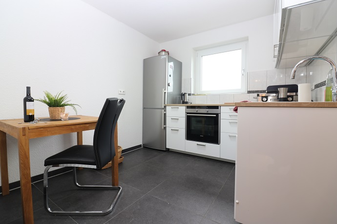Vom Wohn-Eßzimmer sowie vom Gang ist die moderne, helle Einbauküche mit sämtlichen Küchenutensilien und Spülmaschine aus erreichbar. Hier befindet sich noch ein kleiner Eßtisch mit Stuhl.