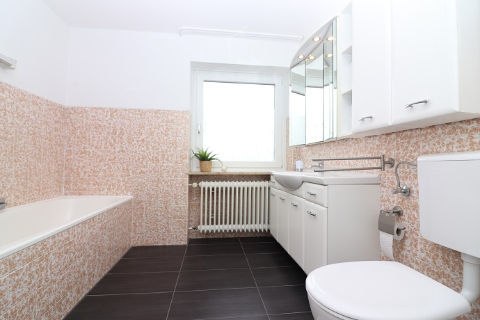 Neben dem Schlafzimmer liegt das helle Tageslichtbad welches über eine Wanne, Dusche und WC verfügt. Ebenfalls ist hier ein praktischer, großer Spiegelschrank vorhanden.