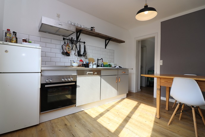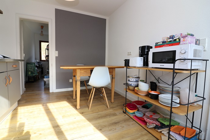 Eine komplett ausgestattete Küche mit Sitzgelegenheit, ein gemütliches Wohnzimmer, das Badezimmer mit Dusche und Waschmaschine sowie eine grosse Terrasse mit Grünfläche und Teich stehen dem Mieter zur Gemeinschaftsnutzung zur Verfügung.