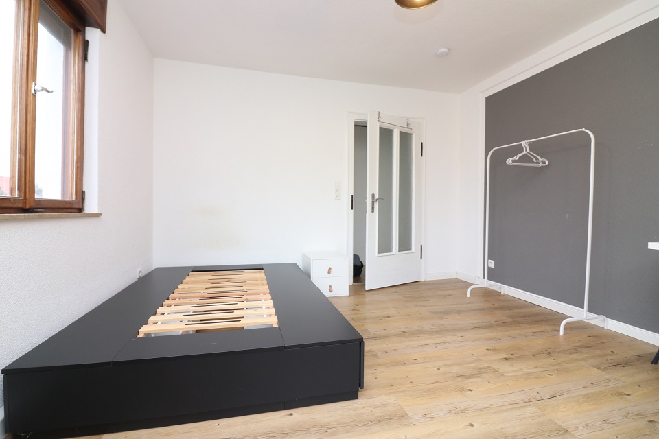 Das ca. 14qm grosse Zimmer ist mit Vinylboden ausgelegt und Teil einer 5-er WG in einem renovierten, urgemütlichen Haus in Rimpar. Die Möblierung besteht aus einem 1,40m breiten Bett (ohne Matratze), einer weißen Kommode, einem Schreibtisch mit Stuhl, sowie einer Kleiderstange und diversen Lampen.