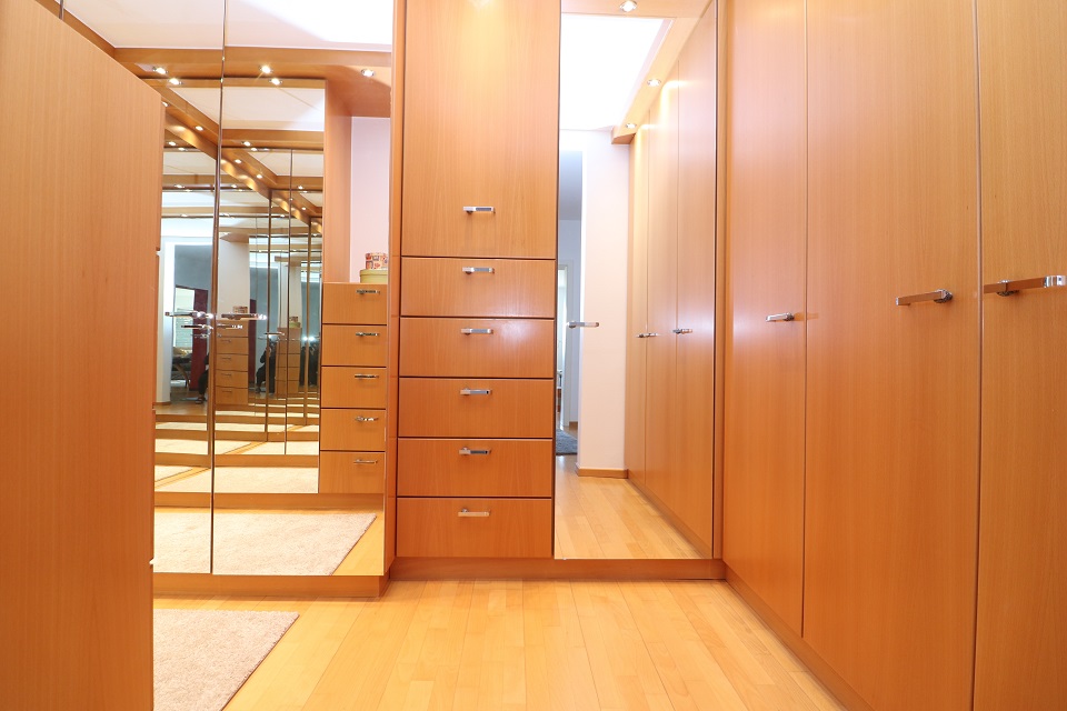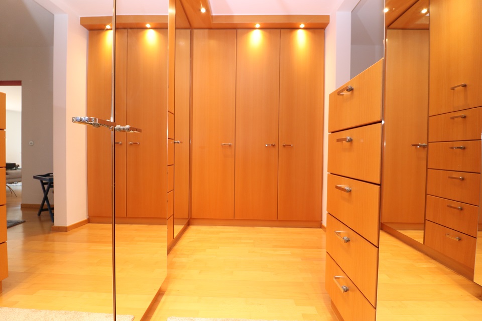 Im angrenzenden Bereich befindet sich das Ankleidezimmer welches mit geräumigen Einbauschränken, Leuchten sowie einem großen Spiegel versehen ist und genügend Stauraum bietet.