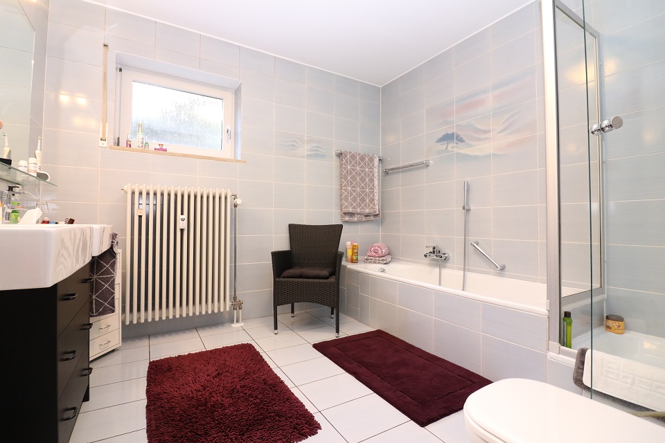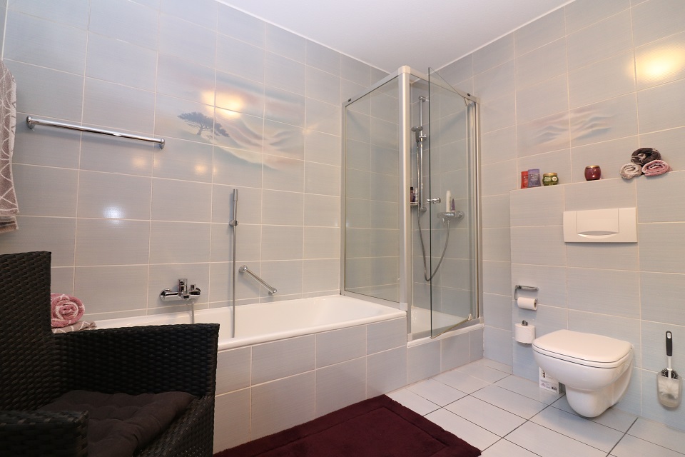 Das Tageslichtbad ist mit ca. 10 qm großzügig geschnitten und verfügt über eine Dusche, Badewanne sowie zwei Waschbecken.