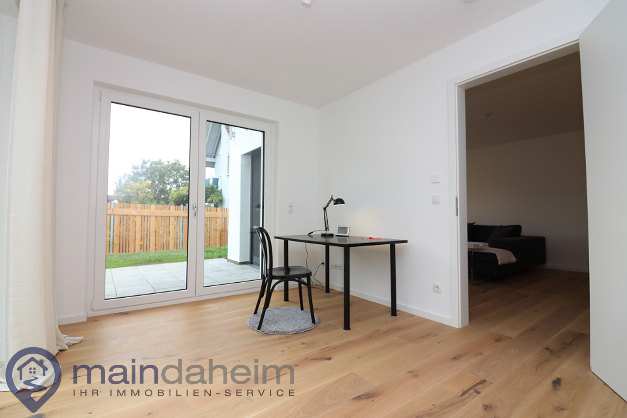 Ebenfalls zur Terrasse zugänglich ist das dritte Zimmer, welches als Gästezimmer oder Büro fungiert. Hier befindet sich hier ein Schreibtisch mit Stuhl, sowie ein Schlafsofa, sodass sich hier eine weitere Schlafmöglichkeit befindet.
