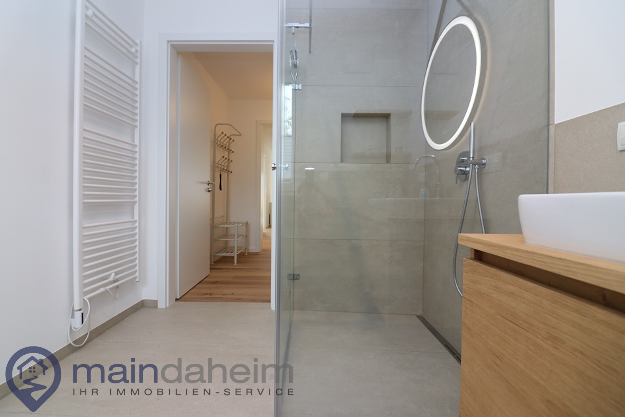 Angrenzend an das Schlafzimmer befindet sich das moderne Tageslichtbad mit attraktiven, gemütlichen Fliesen in beige, welches mit einer bodentiefen Dusche, WC und einem Waschbecken ausgestattet ist.