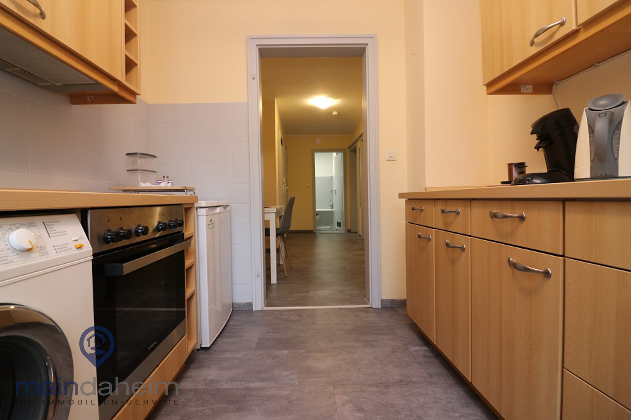 Zur Gemeinschaftsnutzung steht das Badezimmer mit Wanne, sowie die komplett ausgestattete Küche und ein Eßtisch mit Stühlen. Hier befindet sich ebenfalls die Waschmaschine.