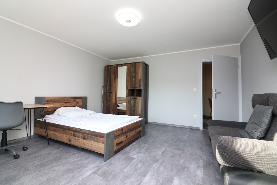 Die Möblierung besteht aus einem 1,40m breiten Bett mit Nachttisch, einem Schreibtisch mit Stuhl, einem Kleiderschrank sowie einen 57 Zoll grossen Flachbild-TV und einer kleinen Couch. Der geräumige Balkon ist von hier aus zugänglich.