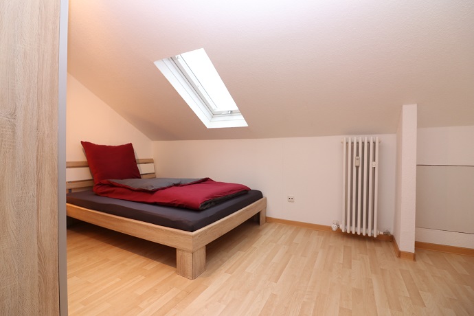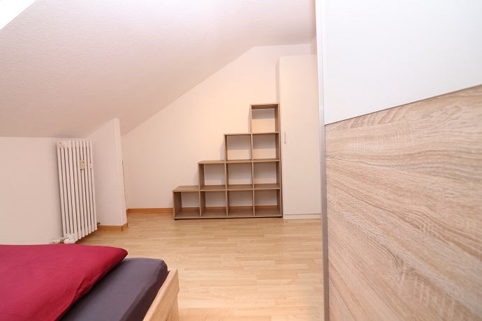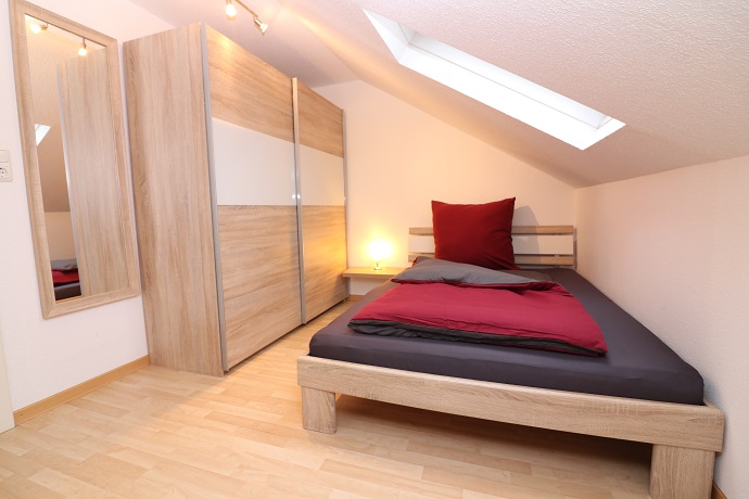 Die Möblierung im Schlafzimmer besteht aus einem 1,40m breiten Bett, einem Kleiderschrank und einem Regal.