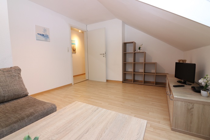 Das Wohnzimmer verfügt über eine Couch, Couchtisch, einem Sideboard mit TV und einem weiteren Regal.