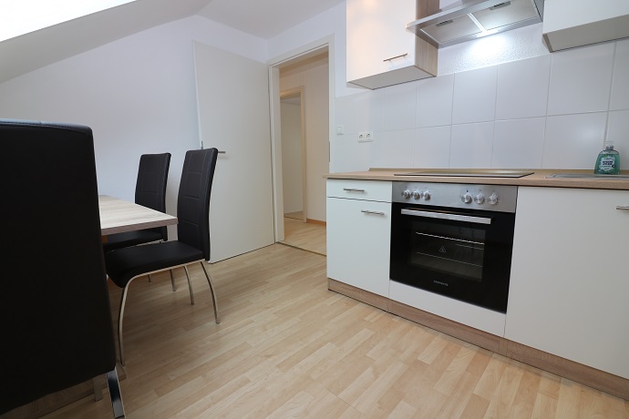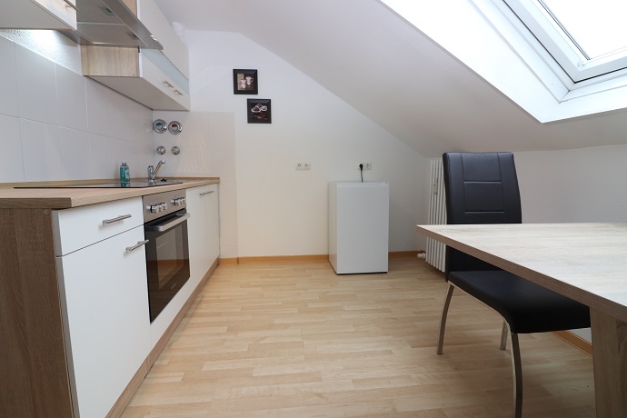 Die komplett ausgestattete neue Einbauküche mit Backofen, Herd, Dunstabzugshaube und Hängeschränken bietet dem Mieter auf Zeit mit einem Eßtisch und drei Stühlen noch eine weitere Sitzmöglichkeit.