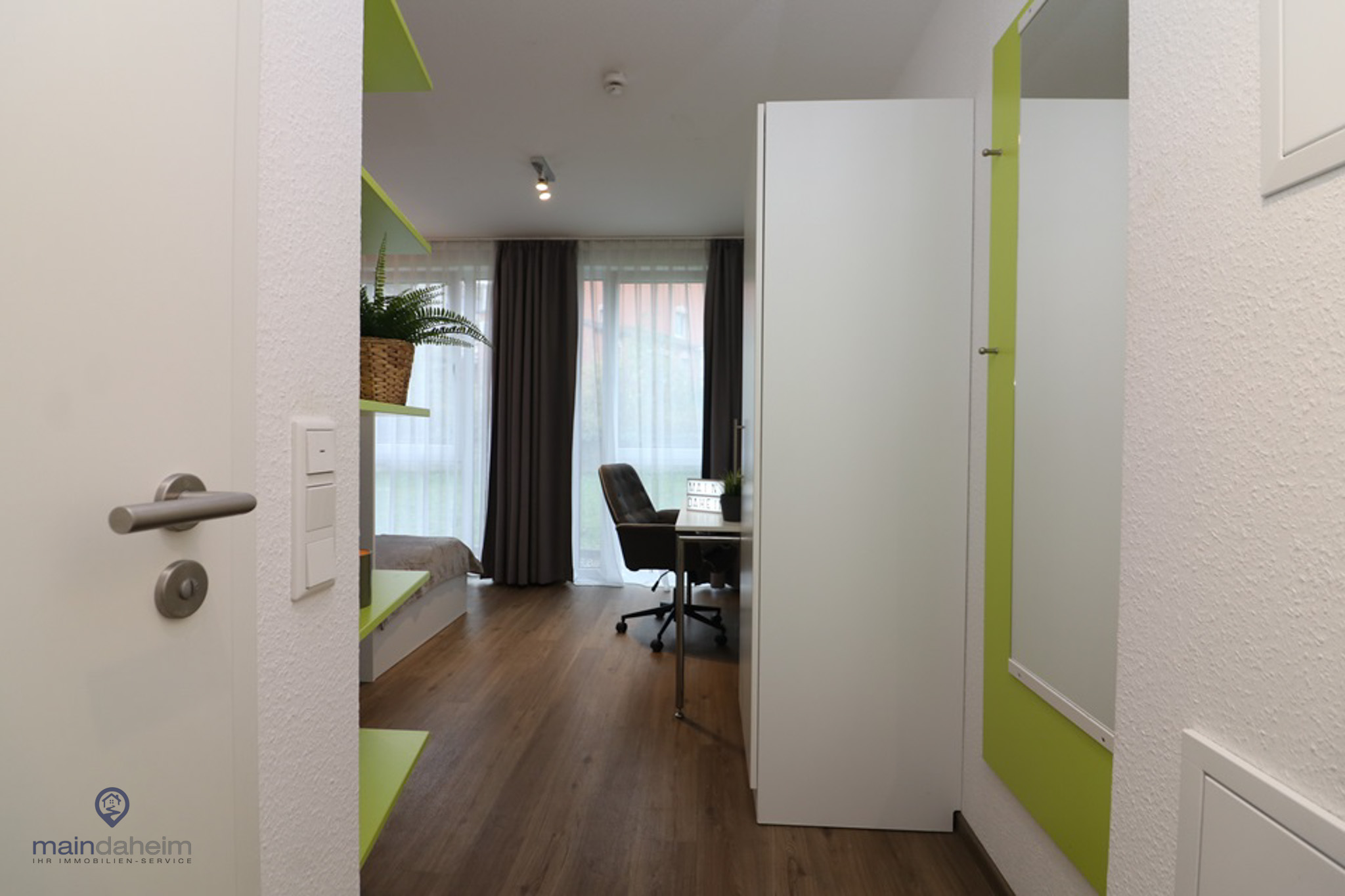 Die Möblierung besteht aus einem Einzelbett mit einer Ablagefläche, einer Stehlampe sowie sämtlichen Einbauschränken und einem geräumigen Schreibtisch mit Stuhl.