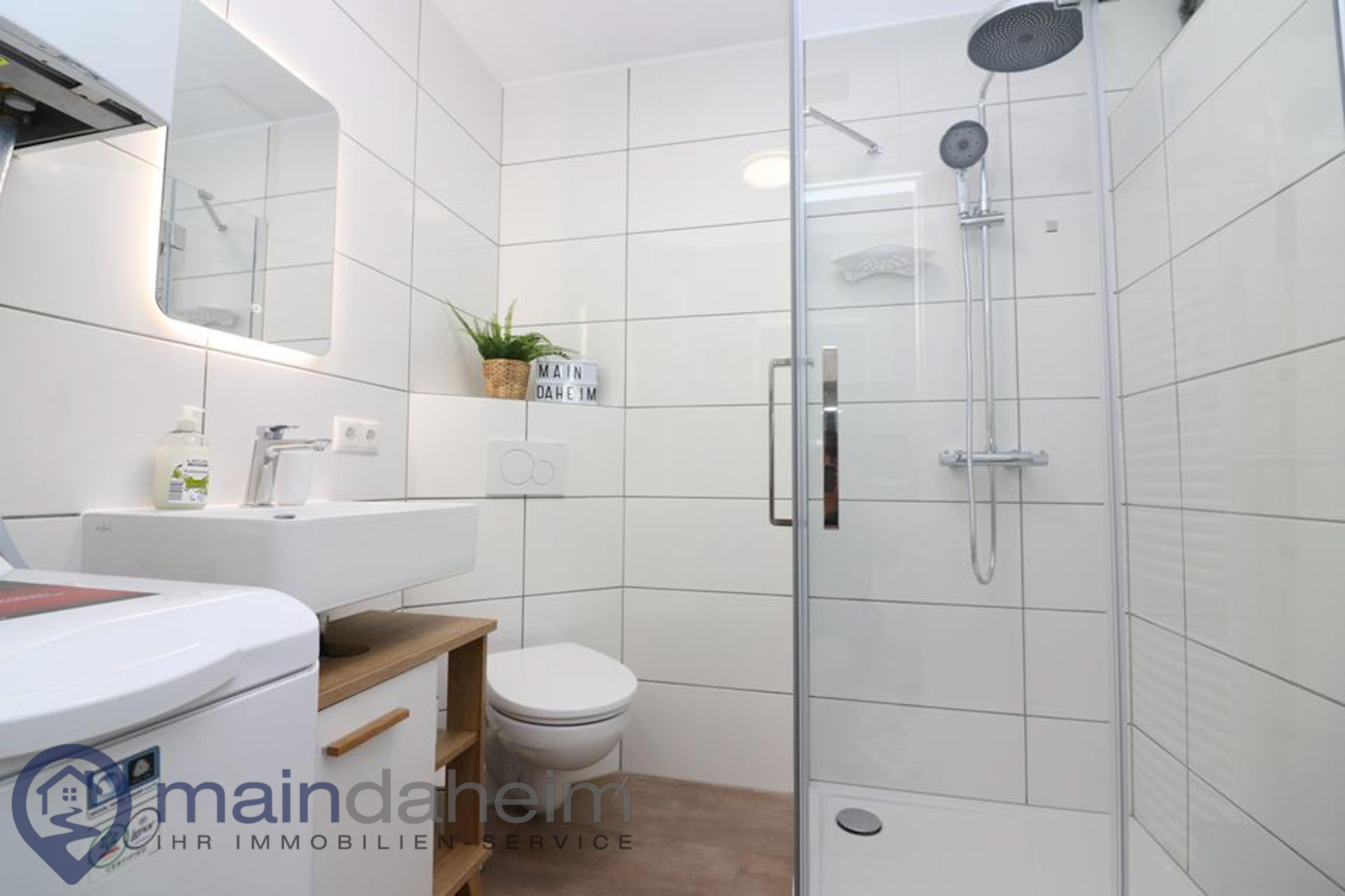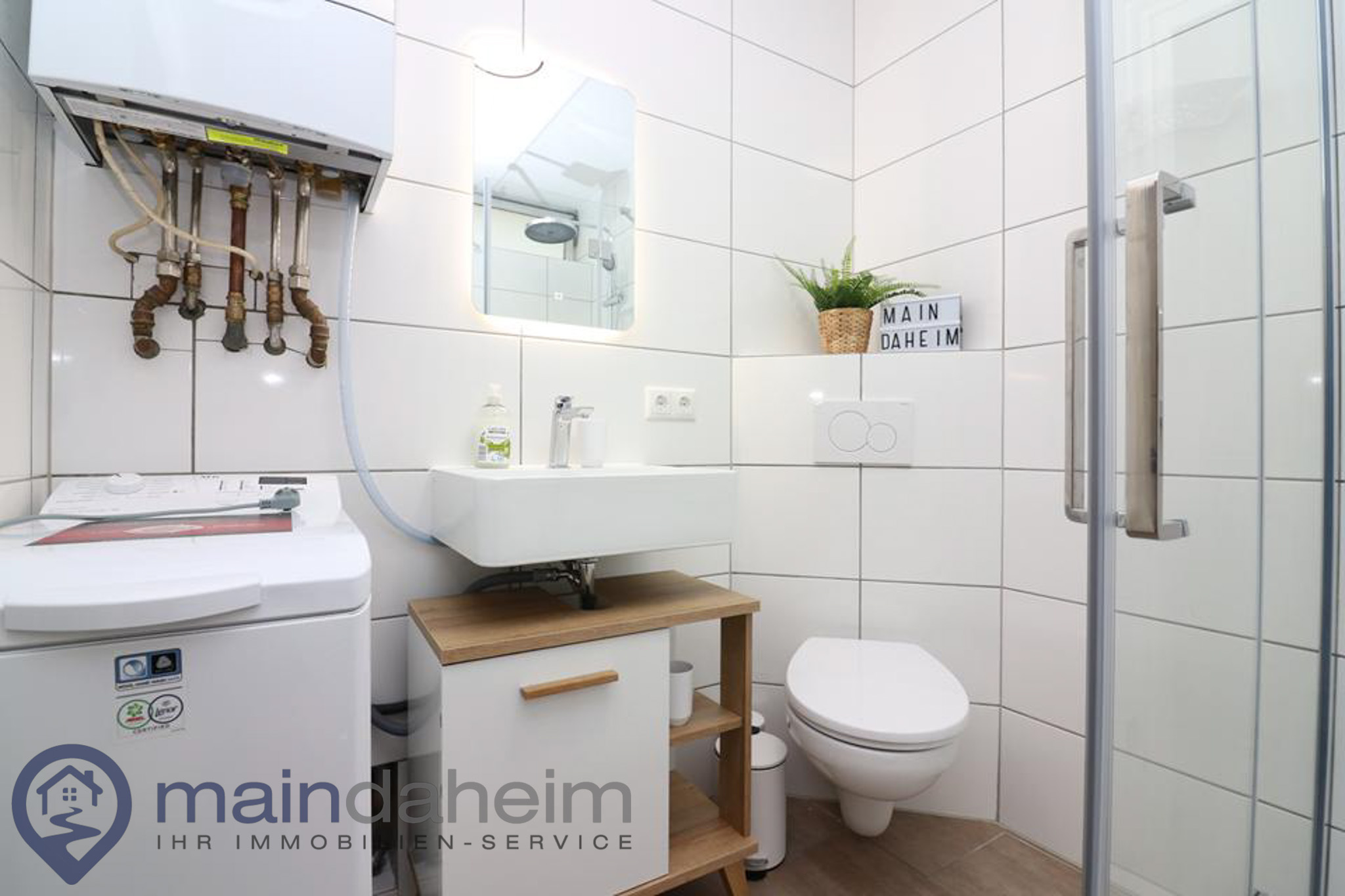 Das modern geflieste und einladende Tageslichtbad verfügt über eine Dusche, WC sowie eine Waschmaschine.