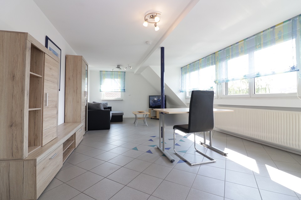 Mit ca. 29qm sehr großzügig geschnitten ist das lichtdurchflutete Wohnzimmer. Die Möblierung hier besteht aus einem Schlafsofa, Couchtisch, Sideboard mit TV sowie einem weiteren Regal und einem Schreibtisch mit Stuhl.