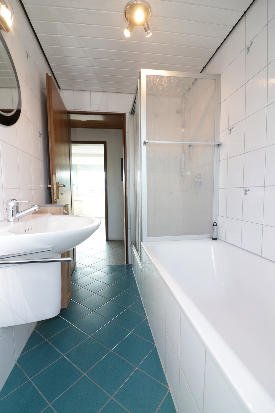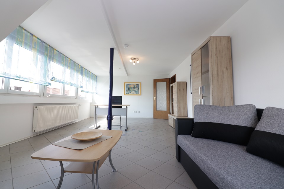 Der ca. 56qm grosse Wohnraum liegt im 2. OG/Dachgeschoß eines gepflegten 3 Parteienhauses und ist mit Laminatboden ausgelegt, das Wohnzimmer mit Fliesenboden. Ein geräumiger Gang empfängt den Mieter. Von hier aus ist das Tageslichtbad mit Wanne, Dusche und Waschbecken zugänglich. Das WC ist separat gehalten. Das Schlafzimmer ist mit einem Einzelbett sowie mit Schränken möbliert.