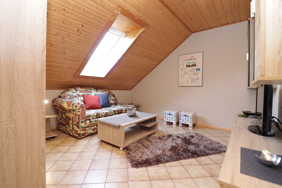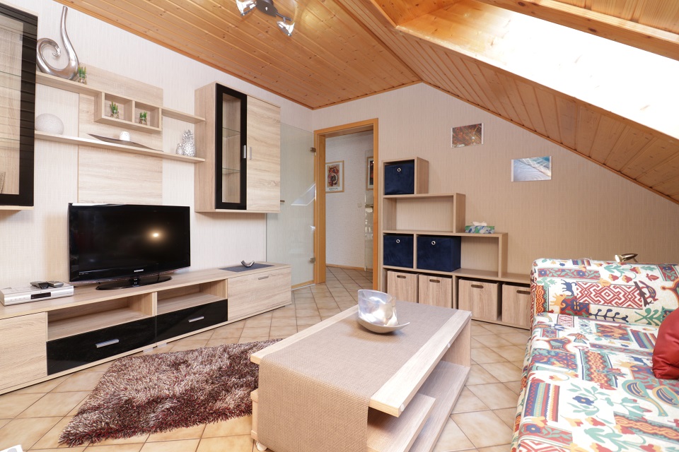 - Wohnzimmer mit Regalen, TV und Sofa (ca. 13qm)