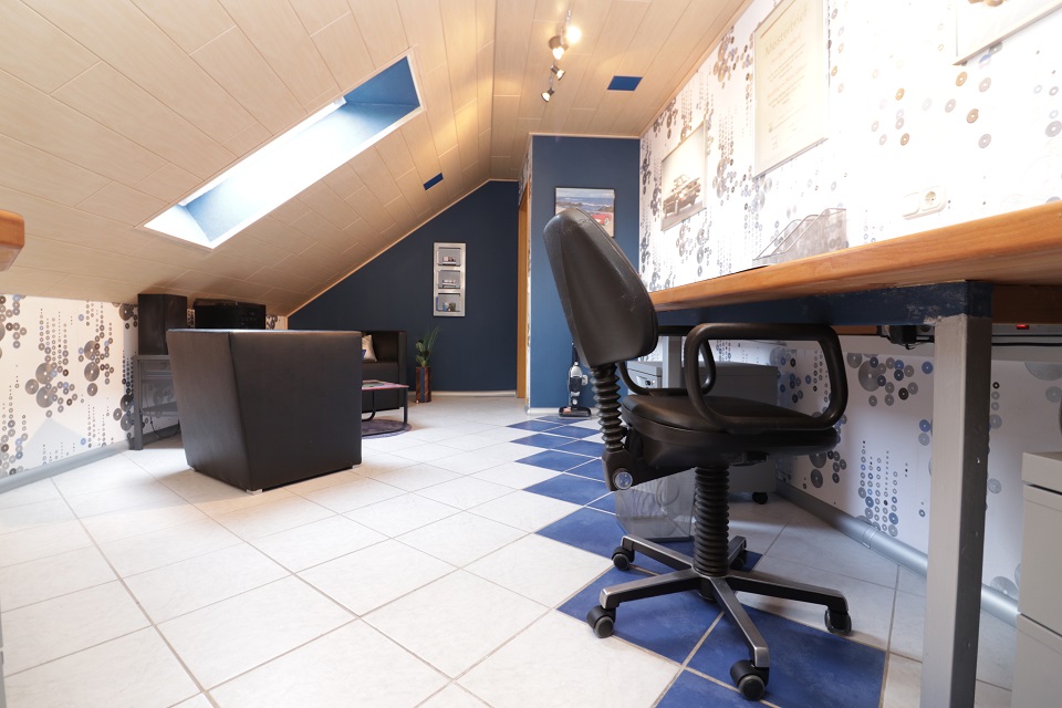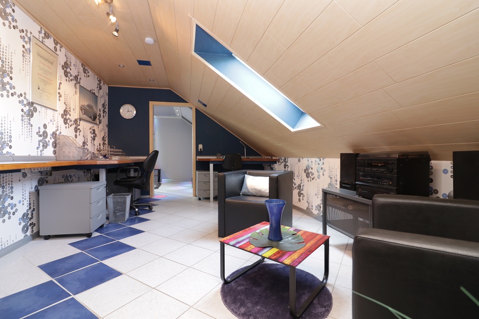 - Ein komplett möbliertes Büro (ca. 15,50qm) mit zwei Schreibtischen und Sesseln.