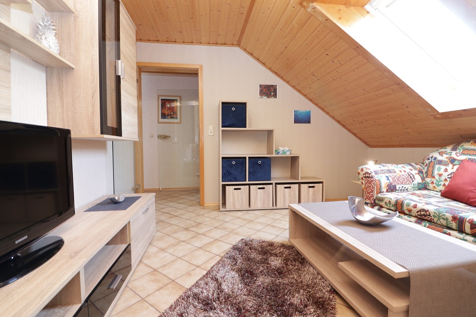- Wohnzimmer mit Regalen, TV und Sofa (ca. 13qm)