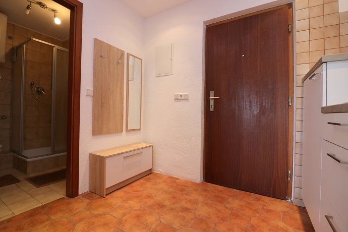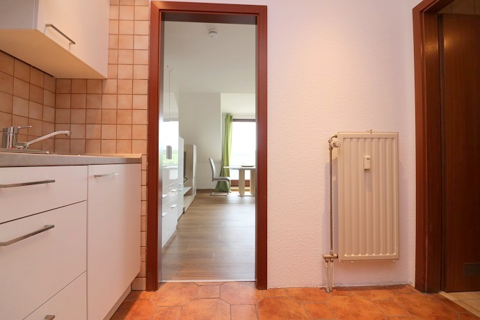 Es empfängt Sie ein großzügig geschnittener, gefliester Eingangsbereich mit einer neuen, weißen Einbauküche und Garderobe.