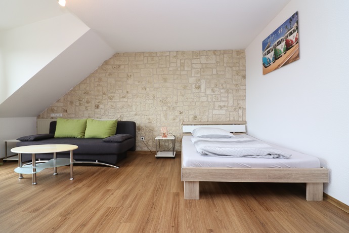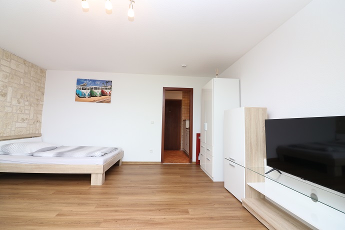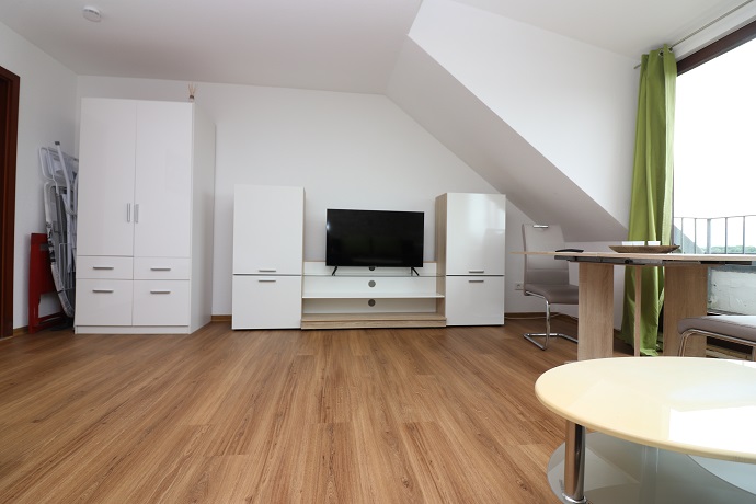 Die Möblierung besteht aus einem 1,40m breiten Bett mit Nachttisch und einem grauen Sofa mit kleinem Tisch. Des Weiteren besteht die Möblierung aus einem Eßtisch mit 4 Stühlen, einem Kleiderschrank sowie einem Regal mit TV und weiterem Stauraum.