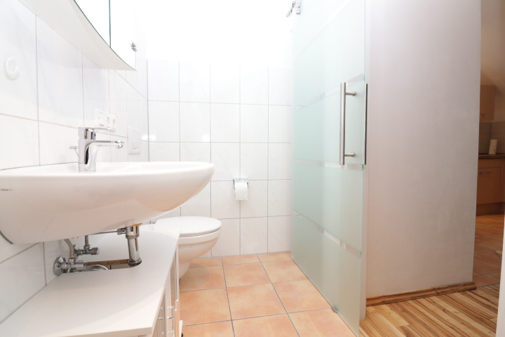 Das moderne Badezimmer verfügt über ein WC und Dusche.