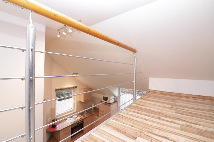 Über eine Treppe ist eine zweite, kleine Ebene erreichbar. Diese kann als Stauraum - oder bei Bedarf als Schlafnische genutzt werden.