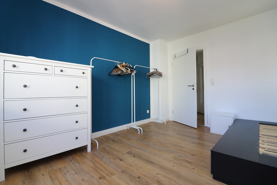 Die Möblierung besteht aus einem 1,40m breiten Bett, einer weißen Kommode, einem Schreibtisch mit Stuhl, sowie einer Kleiderstange und diversen Lampen.