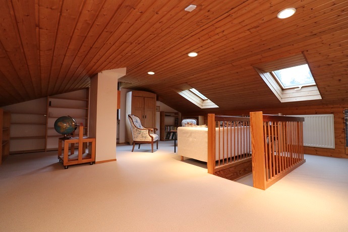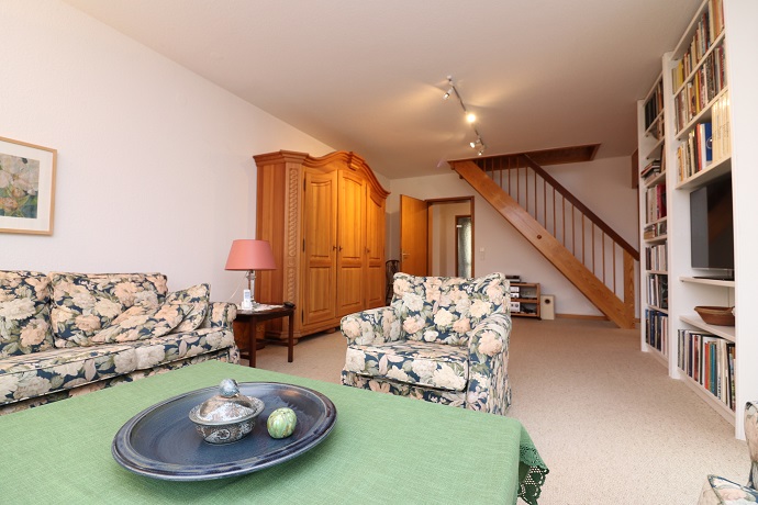 Die Treppe im Wohnzimmer führt in das Dachstudio, welches sich z.B. als Büro eignet.