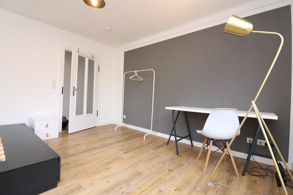 Das ca. 14qm grosse Zimmer ist mit Vinylboden ausgelegt und Teil einer 5-er WG in einem renovierten, urgemütlichen Haus in Rimpar. Die Möblierung besteht aus einem 1,40m breiten Bett (ohne Matratze), einer weißen Kommode, einem Schreibtisch mit Stuhl, sowie einer Kleiderstange und diversen Lampen.