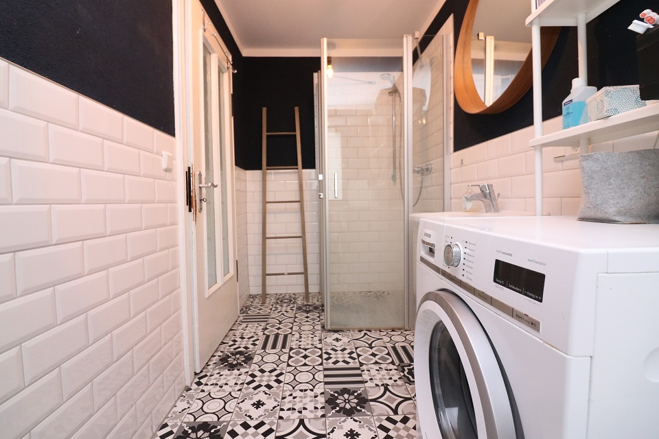 Eine komplett ausgestattete Küche mit Sitzgelegenheit, ein gemütliches Wohnzimmer, das Badezimmer mit Dusche und Waschmaschine sowie eine grosse Terrasse mit Grünfläche und Teich stehen dem Mieter zur Gemeinschaftsnutzung zur Verfügung.